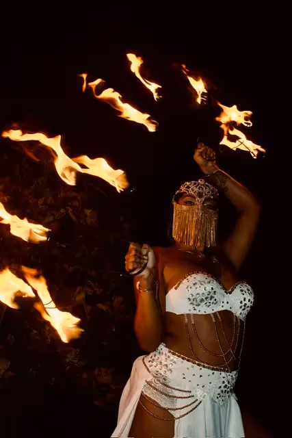 Com figurino profissional, exuberante e asas de LED —, a apresentação incorpora dança, mitologia, espiritualidade, mistério e magia. O número honra o elemento Fogo por meio da pirofagia, utilizando leques e tochas flamejantes, e integra movimentos de Belly Dance, Mudras e Dança Sagrada.